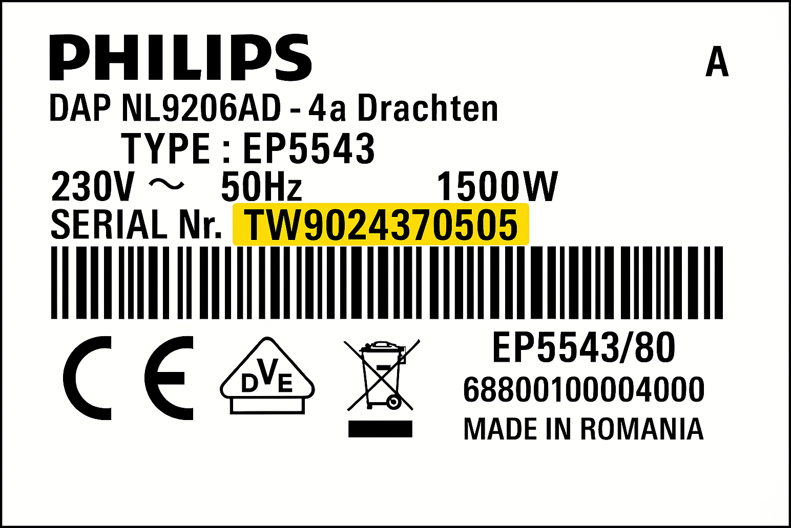 The production date or the serial number is usually located on the type plate underneath the device.The production date is typically 4-6 numbers. For example: 2201 or 220101. The serial number typically starts with 2 letters, followed by letters and numbers. For example: TW1A2303123456.