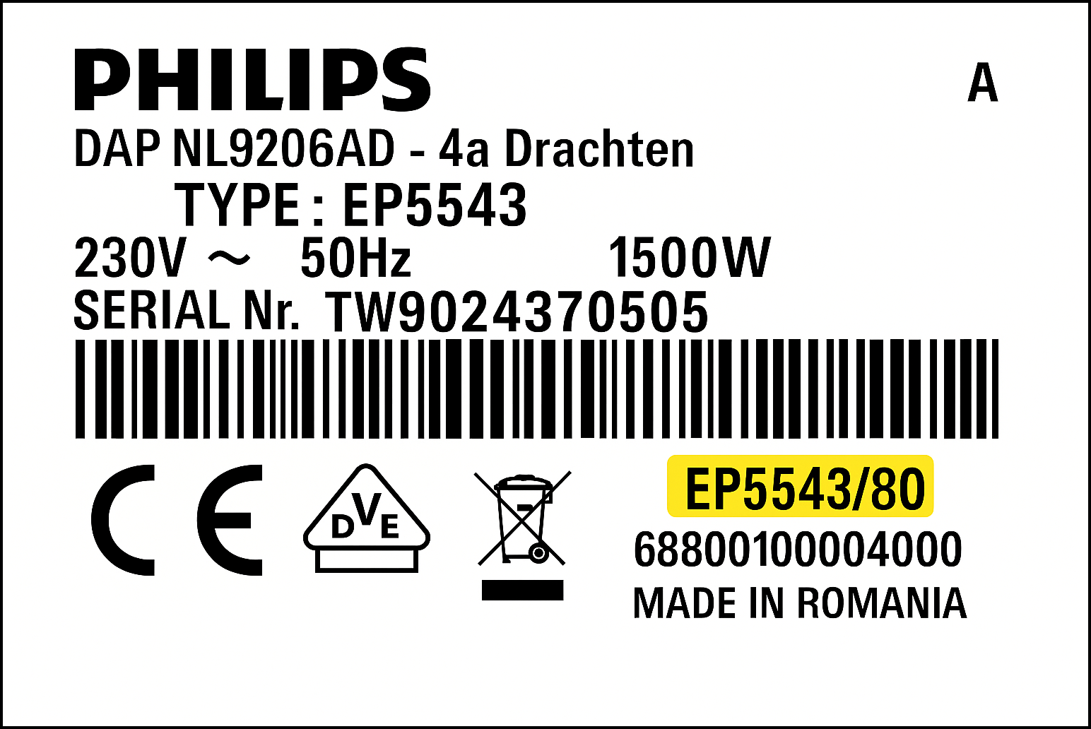 The model number starts with 1-3 letters followed by numbers. For example: EP5544. Model numbers are printed on the type plate of the product.